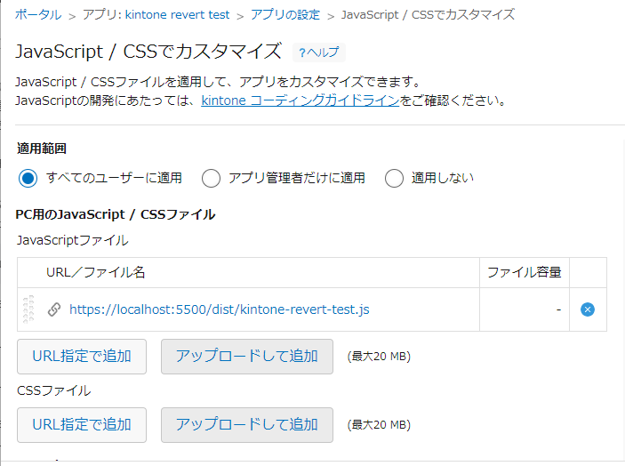 ちなみに、このサンプルを入れてあるフォルダ名が revert_live_server となっているのが、ちょっと気になるかもしれません。これは、開発した js ファイルをアップロード後、再度 Live Server 環境に戻すときのサンプルも兼ねているためです(これもいちいちアプリごとに指定する必要があるんですよね)。これについてもそのうち記事にまとめたいと思います。