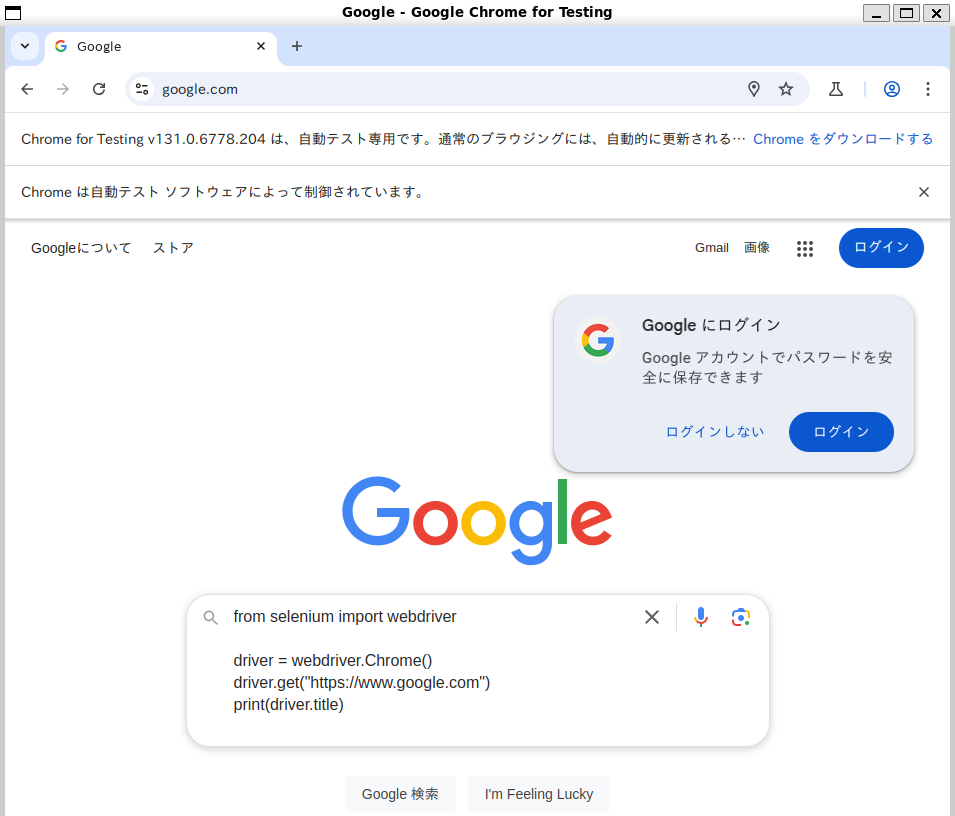 from selenium import webdriver driver = webdriver.Chrome() driver.get("https://www.google.com") print(driver.title)