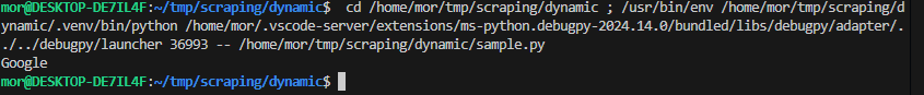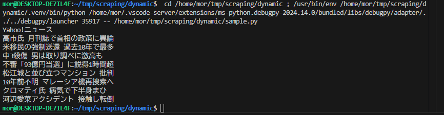 (.venv) mor@DESKTOP-DE7IL4F:~/tmp/scraping/dynamic$ pip install selenium Requirement already satisfied: selenium in ./.venv/lib/python3.13/site-packages (4.27.1) 略