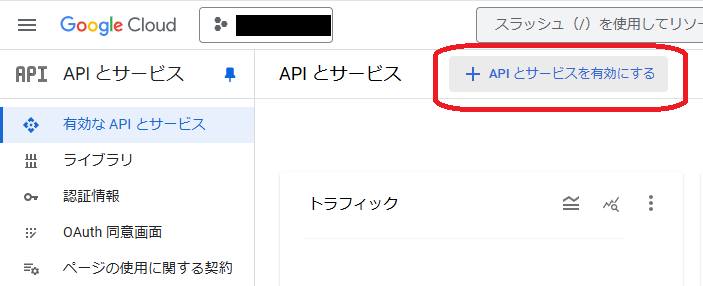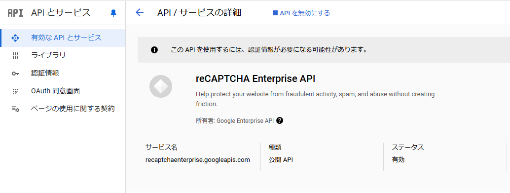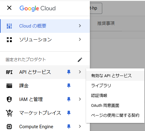 次に、Google Cloud コンソールで、 reCAPTCHA Enterprise API ページを開きます。まず、サイドメニューの『APIとサービス』->『有効なAPIとサービス』を選択します。