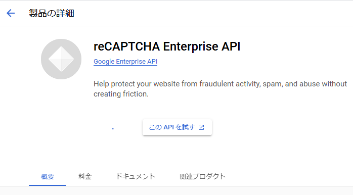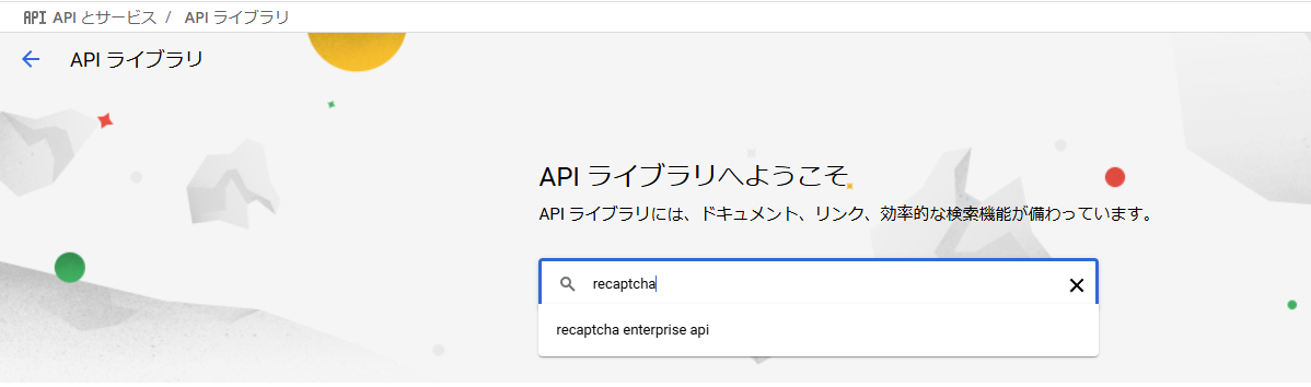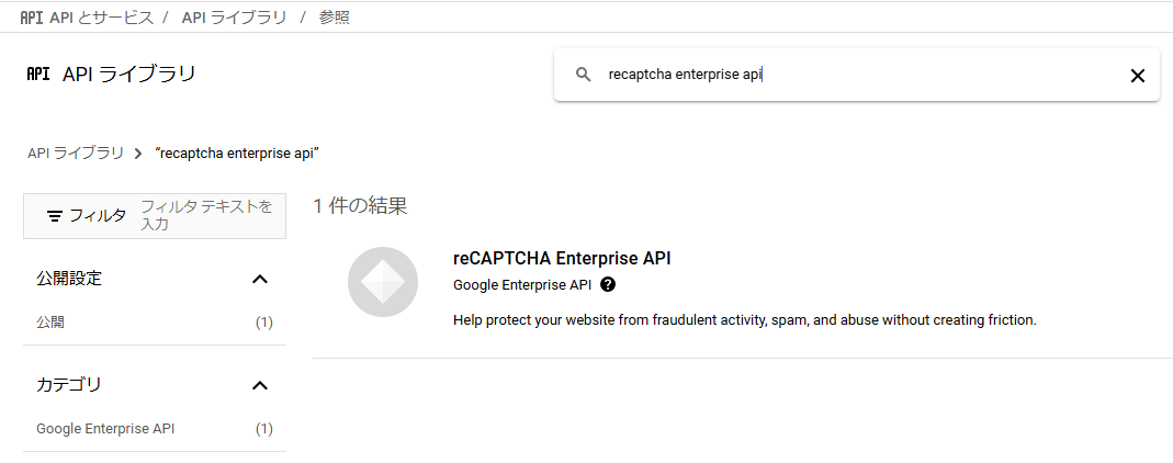 『recaptcha』と入力すると、『recaptcha enterprise api』が候補に出てくるので、選択すると、