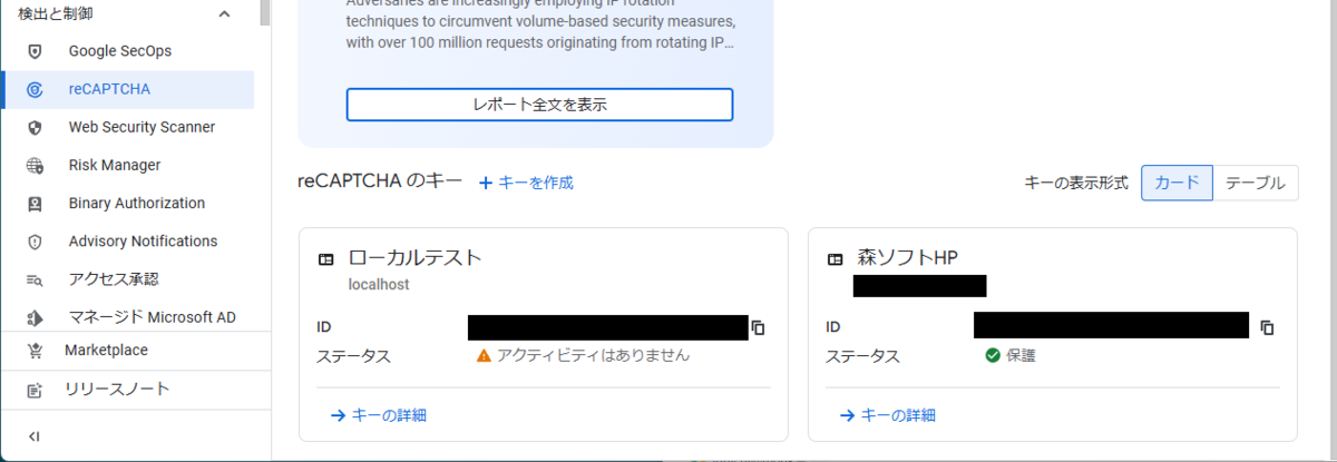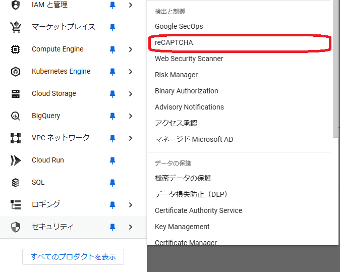 次に、Google Cloud コンソールのサイドメニューから『セキュリティ』->『reCAPTCHA』を選択して、 reCAPTCHA ページを開きます。