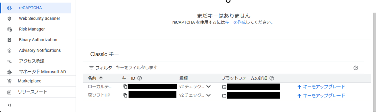こんな感じに reCAPTCHA Classic のキーが表示されています。