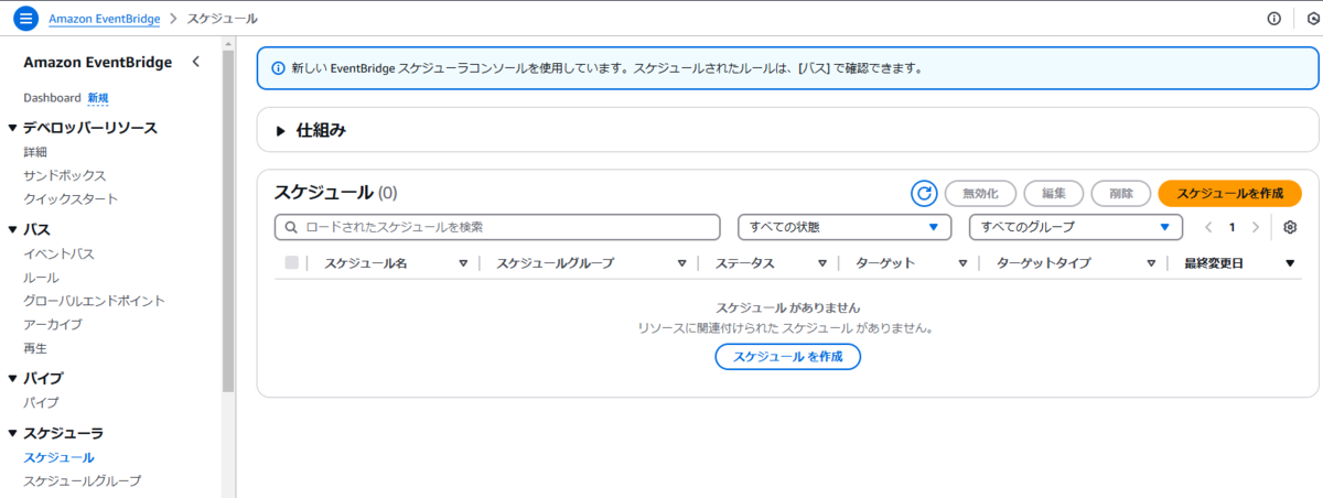 まずは、 aws のコンソールから、 EventBridge のスケジュールを選択して、