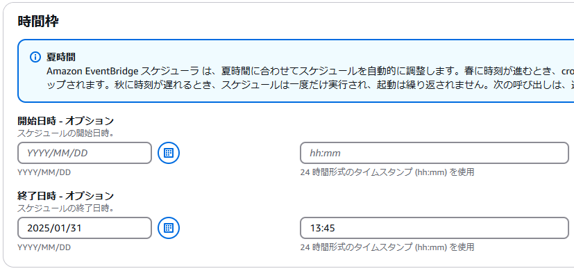 スケジュールを停止し忘れたときに、Lambda 関数を呼び出すのが無限に続くといやなので、停止時刻を日付付で指定しておきます。