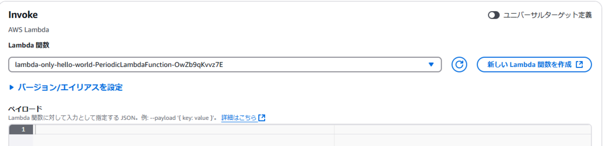 Lambda を選択すると、関数をドロップダウンリストから選択できます。また、新規作成もできるようですし、バージョンやエイリアスを指定することもできます。また、ペイロードを指定すれば、呼び出し引数を渡すこともできますね。