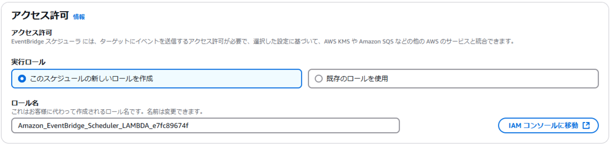 最後に、実行ロールを指定します。既存のロールがなければ、スケジュール用に新しいロールも作成してくれます(ロールとそれにアタッチするポリシーも作ります)。