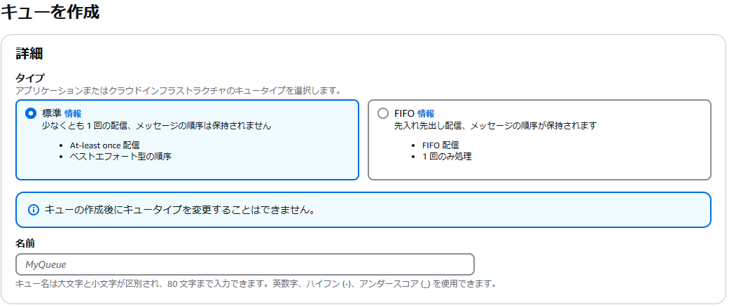 キューの名前は必ず入力します。あとはデフォルトのままでも問題ないかと思いますが、 SQS からメッセージを読みだす処理を作成しないなら、『メッセージ保持期間』は長めにしたほうがいいかもしれません。