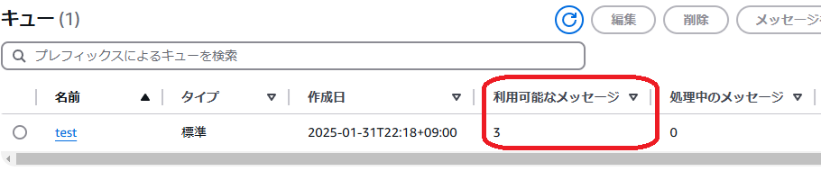 ということで、設定に問題が無ければ、この時点で先ほどのメッセージが SNS トピックに送られているはずです。改めて、 SQS を見ると、