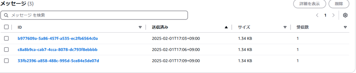 Scheduler の終了時刻を調整して、 Lambda 呼び出しを実行します。しばらくしてから、 SQS を見てみると、