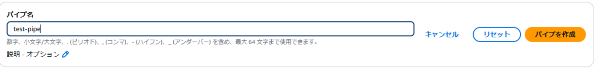 aws コンソールからパイプを開いて、『パイプの作成』を選択します。最初にパイプ名を入力します。