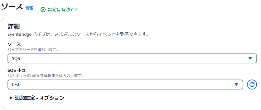 でも、その前にソースとターゲットの設定以外のオプションを替えてなければ、パイプが作成された時点で有効になっています。先ほどのテストで、SQS にメッセージが入っていたと思います。