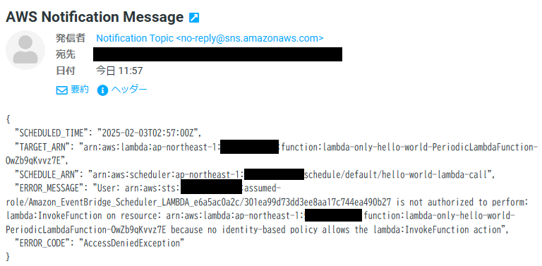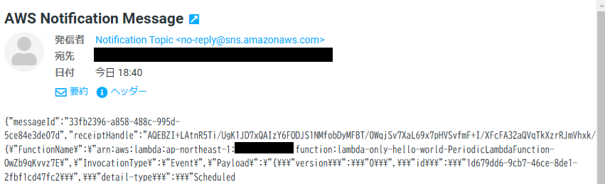 念のため、再度 Scheduler を起動すると、Lambda を呼び出したタイミングで、先ほどのメールアドレスにメールが届きます。問題ないようですね。